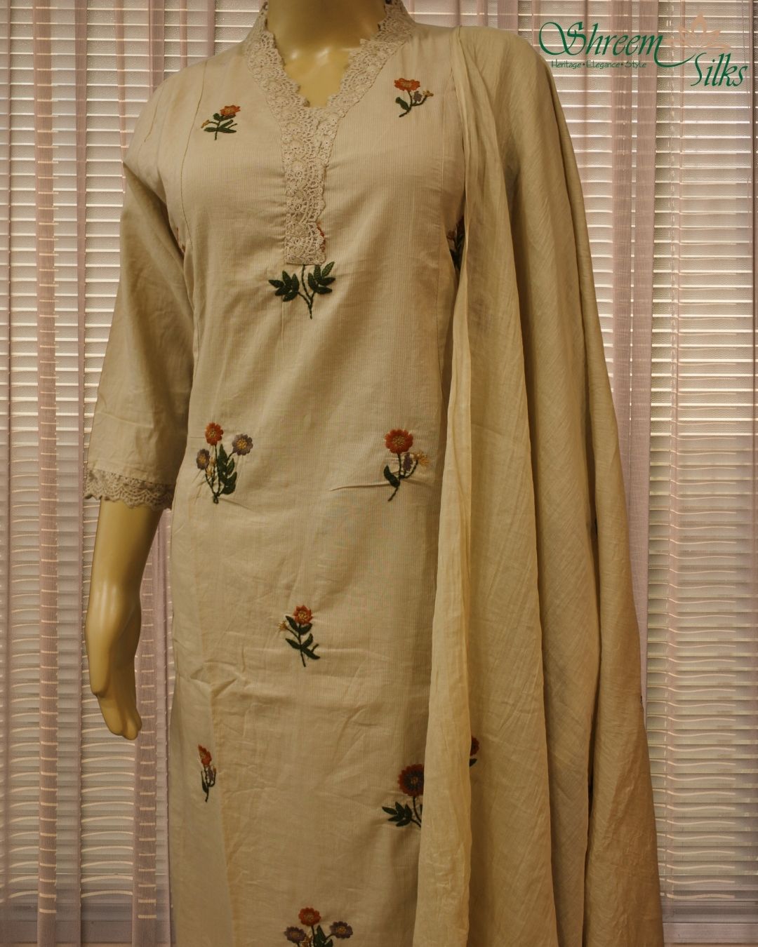 Beige Floral Thread work Kurta Set