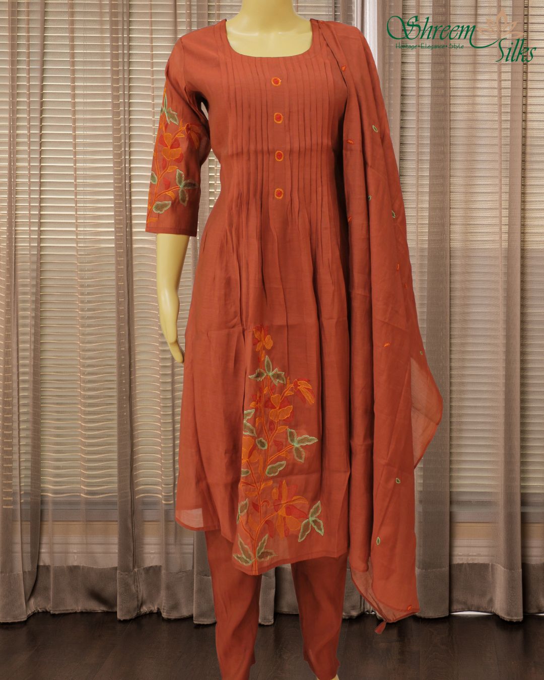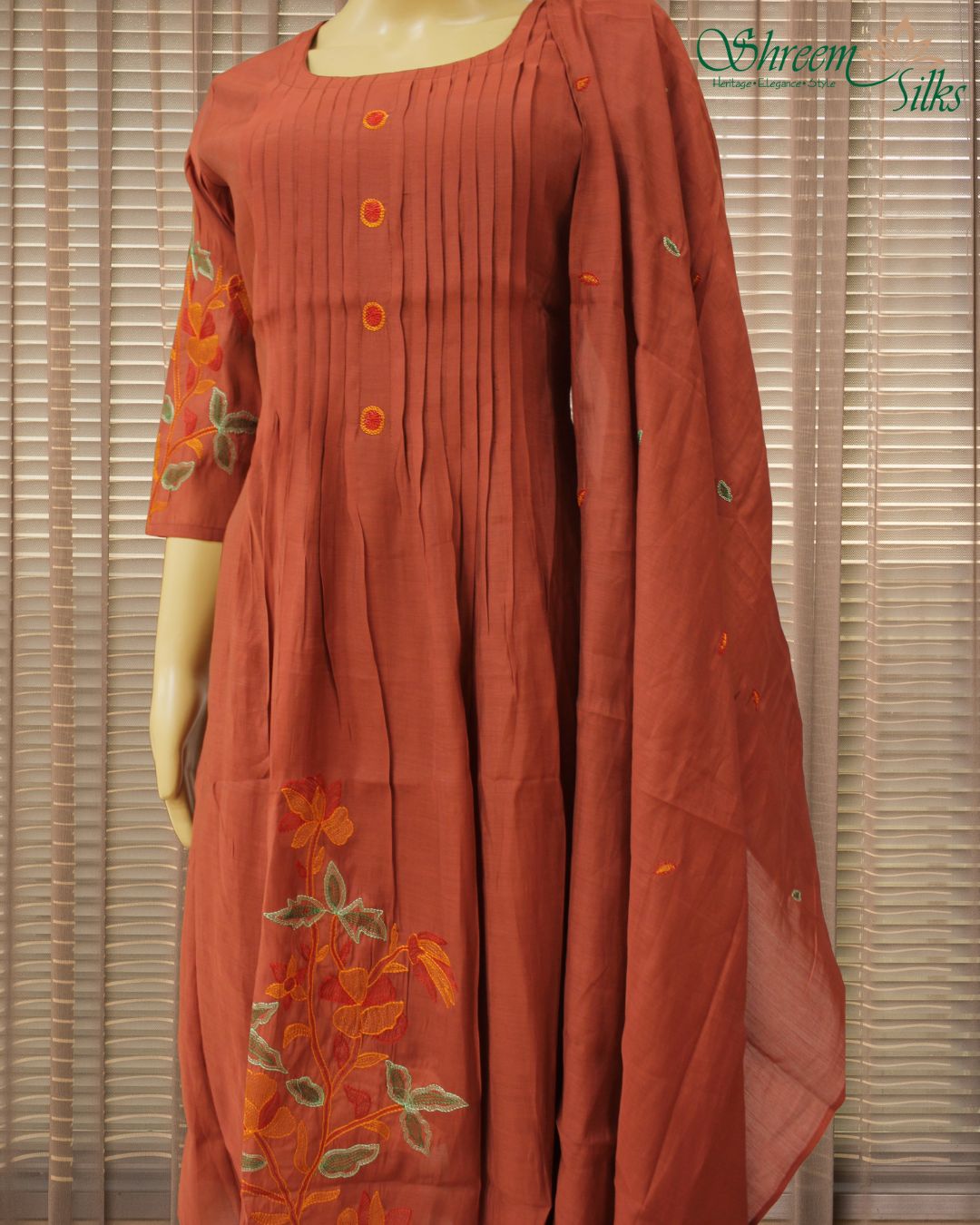 Floral Embroidered Mul Chanderi Anarkali Kurta Set – Rust