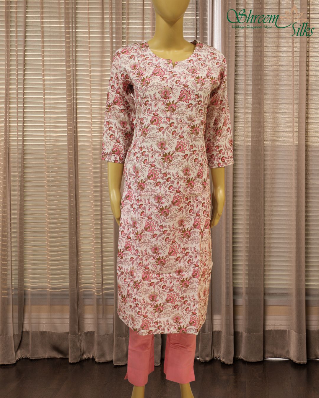 Floral Prints with Kantha & Sequence work Cotton Kurta Set – White & Pink