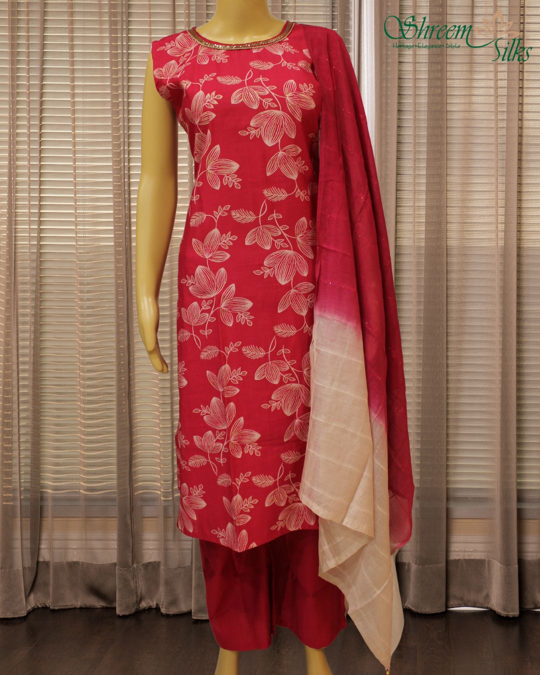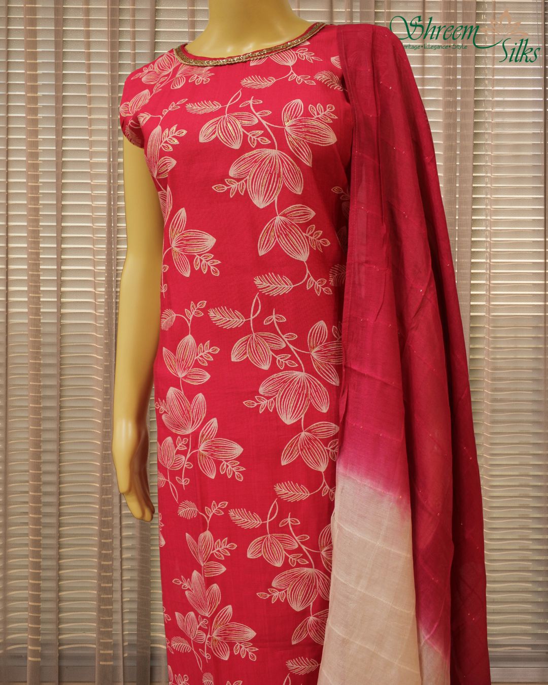 Fuchsia Pink with White Prints & Cut Dana work on Neck Line Kurta Set
