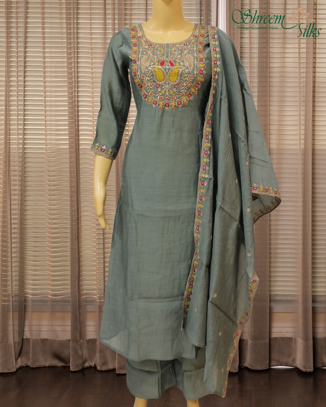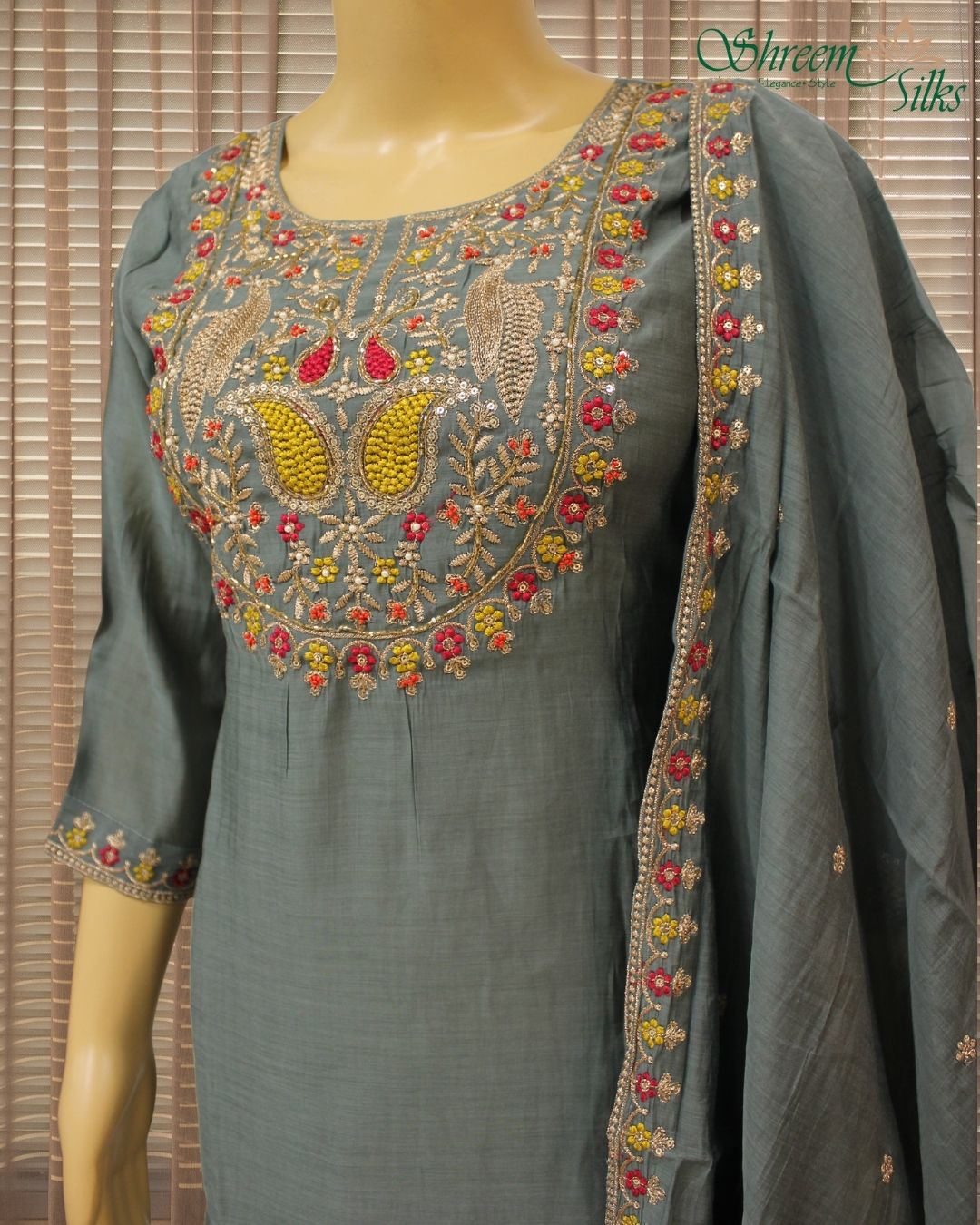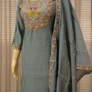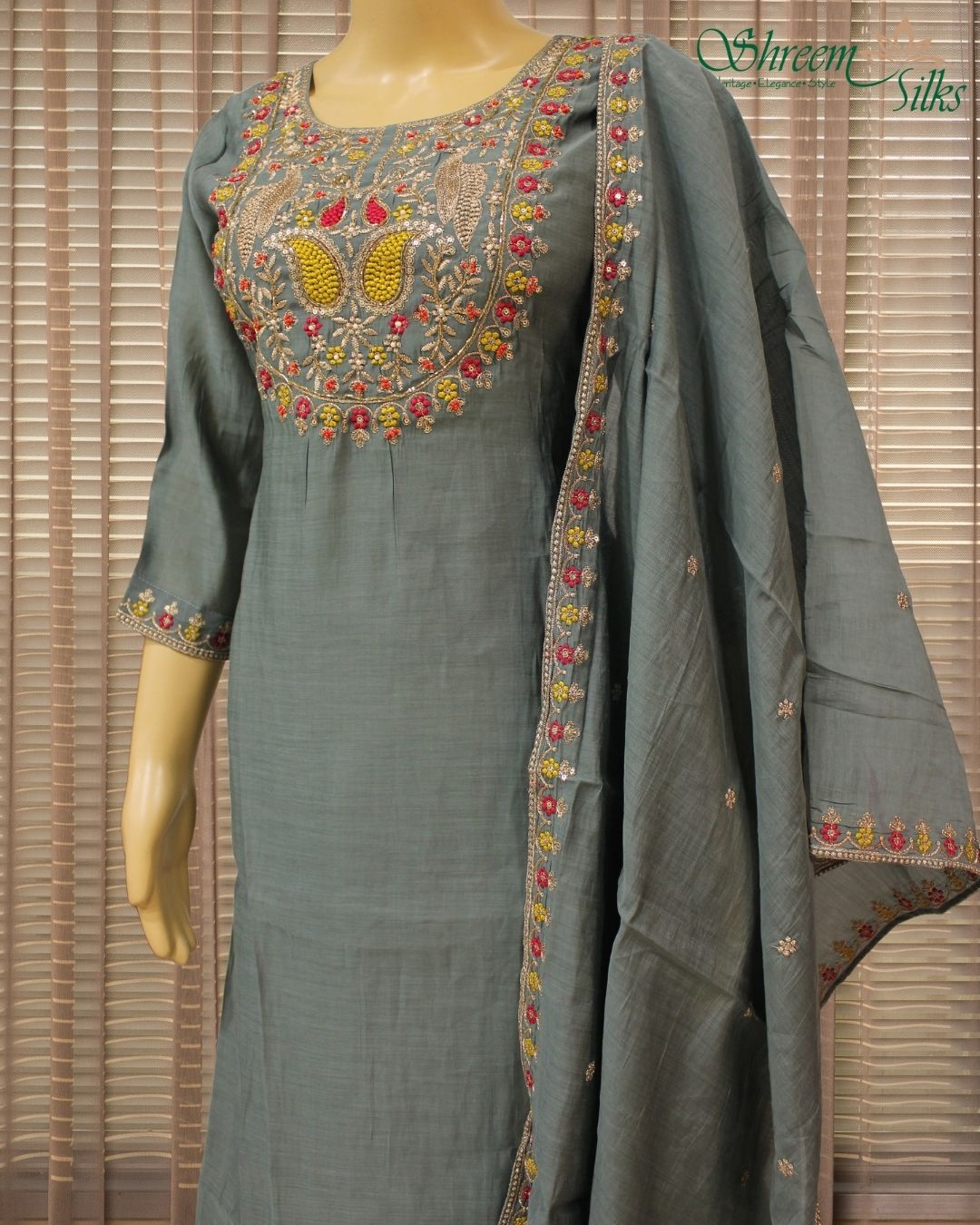 Grey with Gold Thread work on Yok Mul Chanderi Anarkali Kurta Set