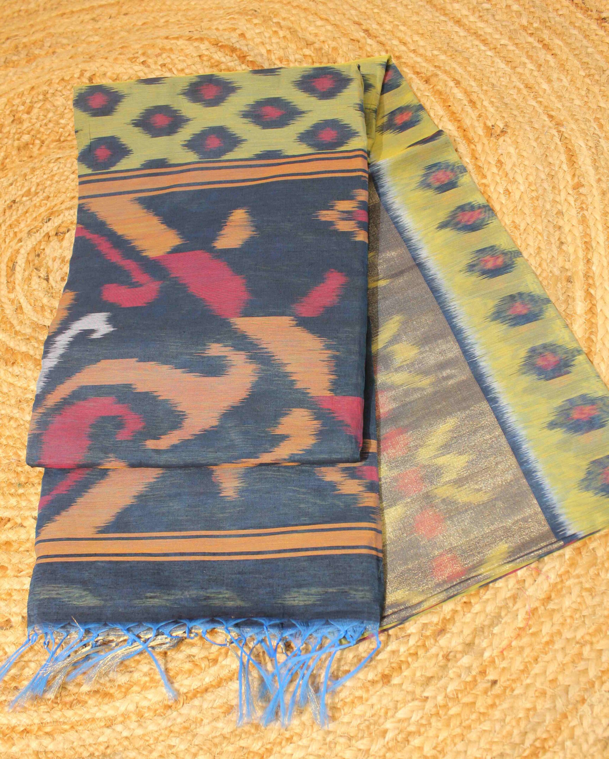 Ikkat Yellow & Blue Tissue Border Cotton Silk Saree
