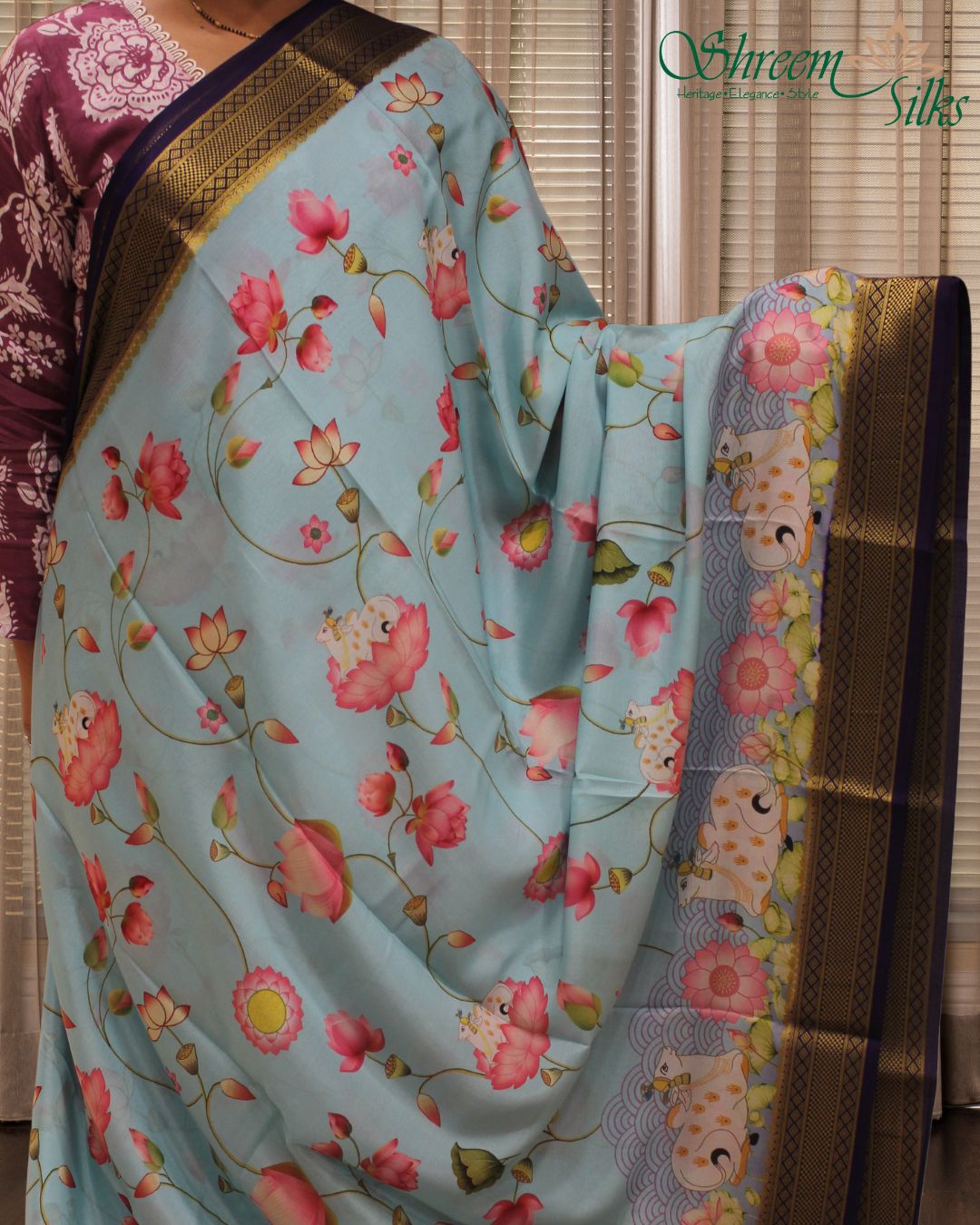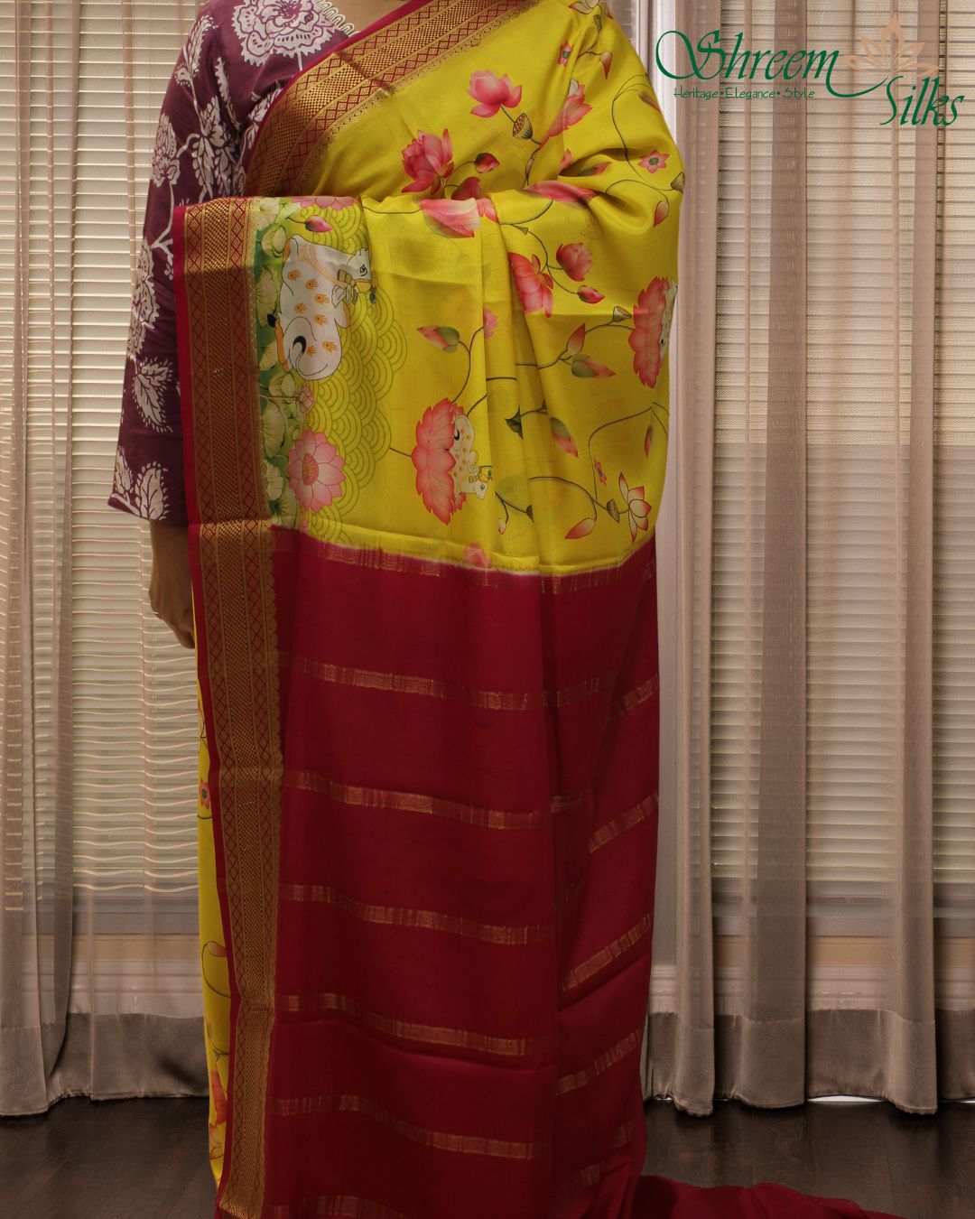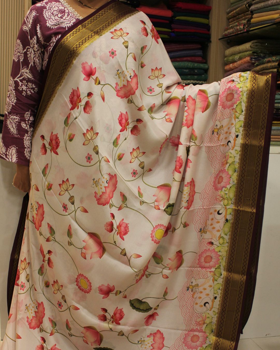 Lotus Pichwai Prints Pure Mysore Crepe Silk Saree