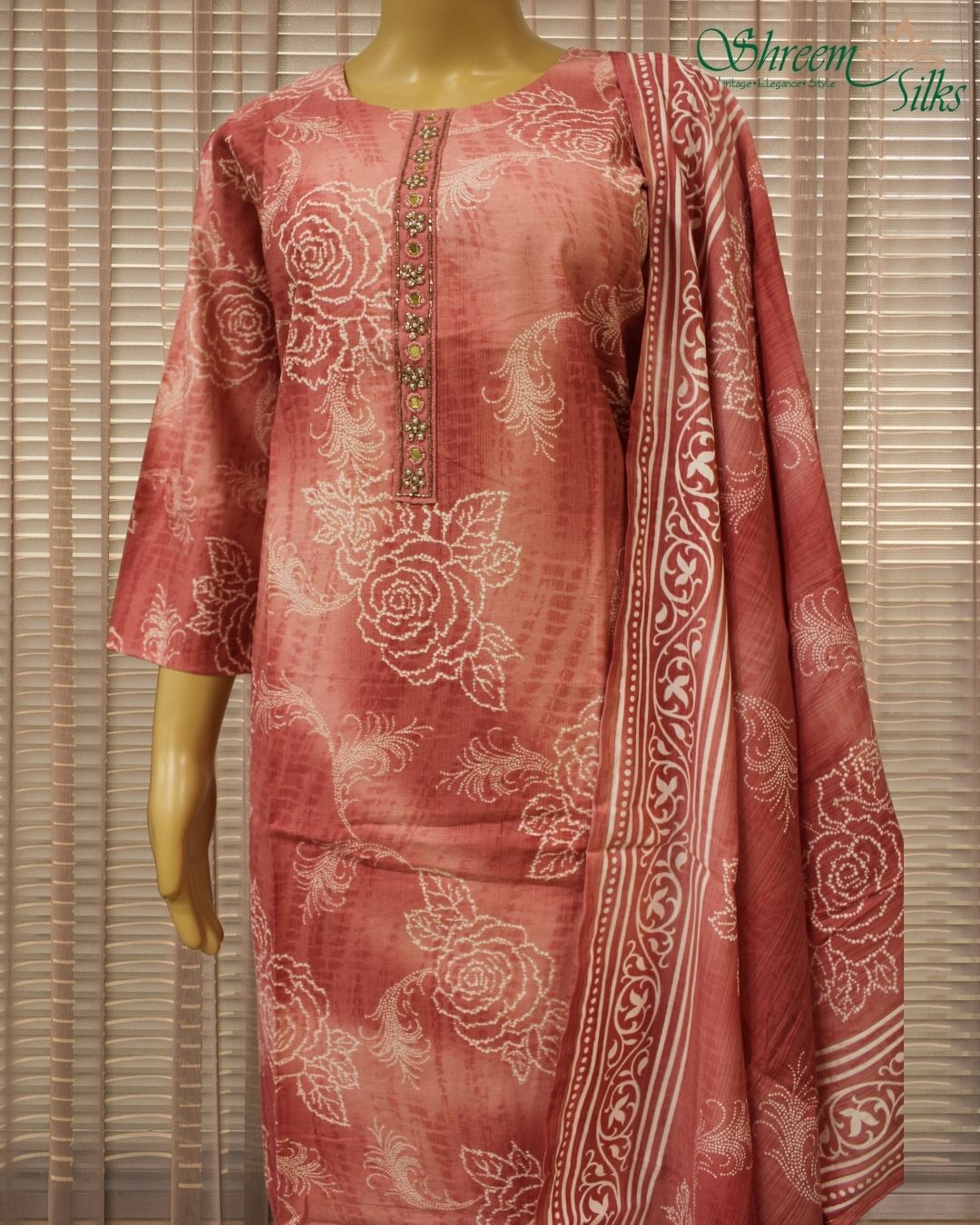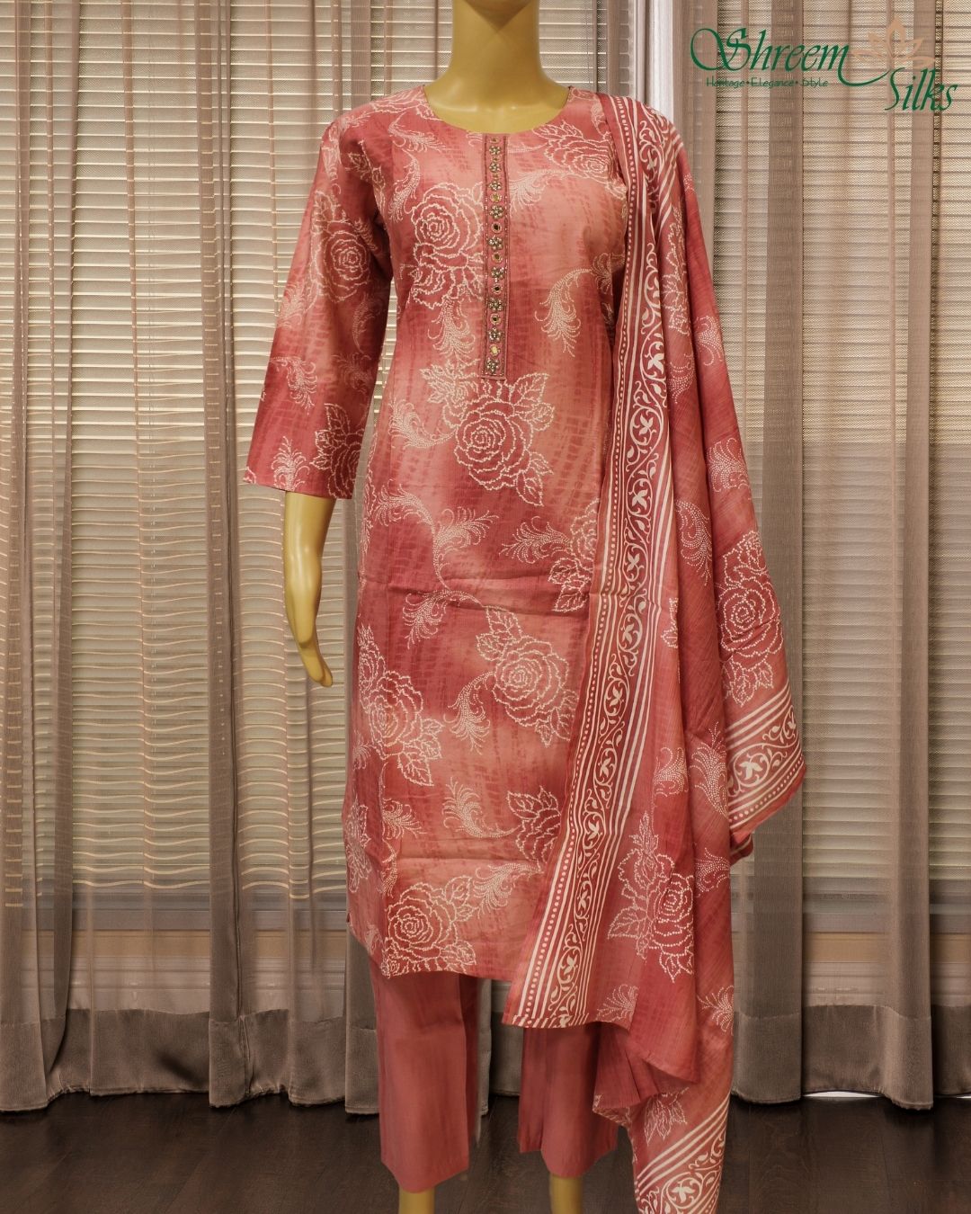 Brown with Geometrical Print & Neck Embroidery Work Kurta Set