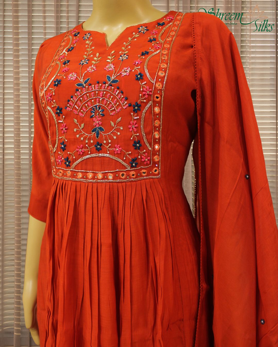 Thread & Mirror work on Yok Mul Chanderi Anarkali Kurta Set – Orange