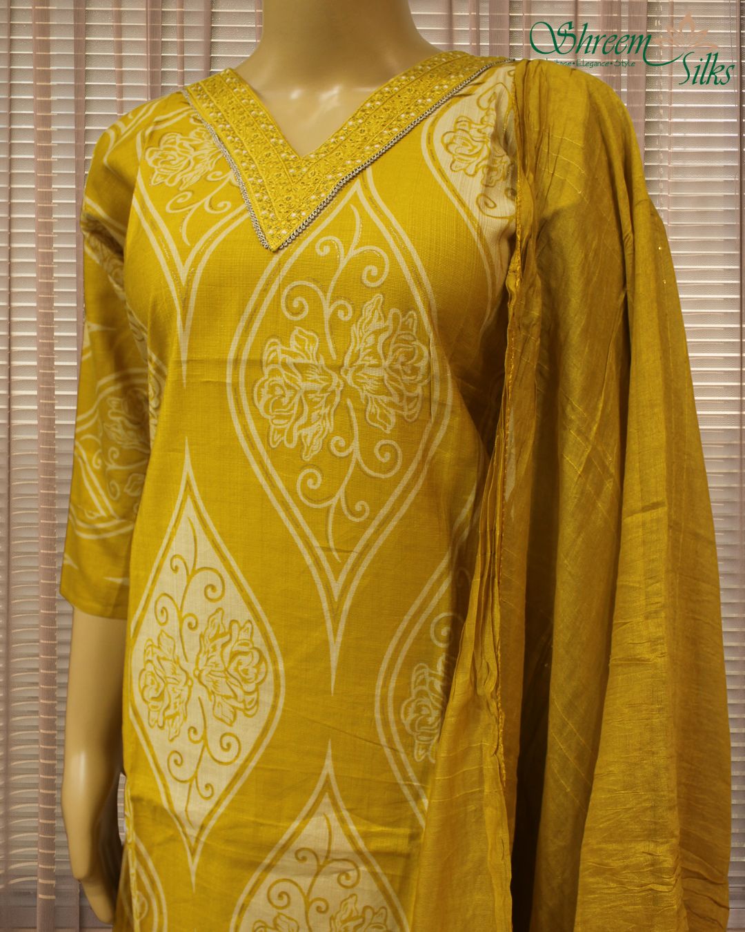 Thread work on Neckline Printed Kurta Set – Mustard